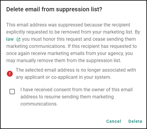 To remove the email address from the Suppression list, check the consent box and select Delete. You can use the Cancel option to close the confirmation box.
