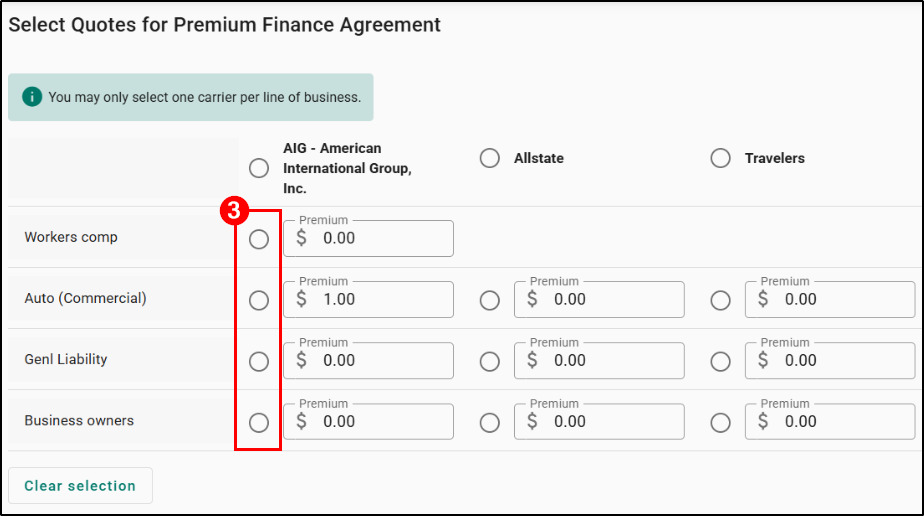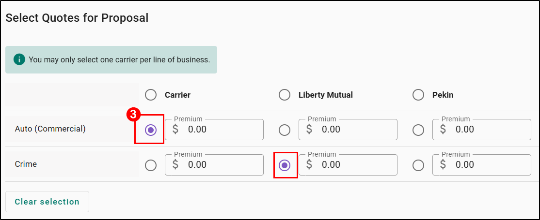 3. Choose which of the carriers you'll be proposing. The premium amounts are pre-filled from the required Premium Field when you change an LOB's status to quoted.