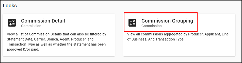 The Commission Grouping Report is a Look that allows you to view all commissions aggregated by Producer, Applicant, Line of Business, Carrier, Lead Source or Transaction Type. Look reports are focused on a table of data rather than visuals like pie charts. This allows you to deep dive into the commission data rather than get a high level picture.