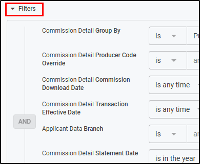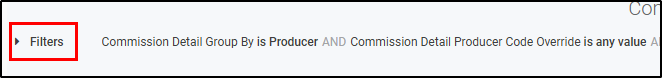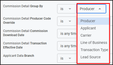 | Compare By | Commission Detail Group By | Single-Select | This filter controls how the data is grouped together. i.e. Producer, Applicant, Carrier, etc. |