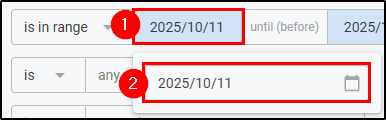 - To apply a date filter, use the "is" and value dropdown to choose your preferred options. Select the date dropdown and either type in the date or select the calendar icon to open a date picker calendar.