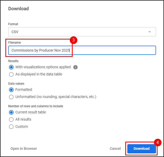 3. Update the file name if necessary. We recommend leaving the other options on their default settings when downloading a report.