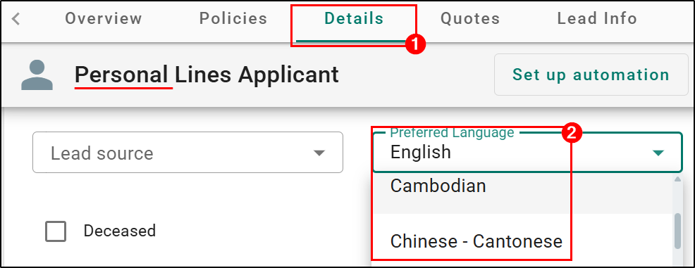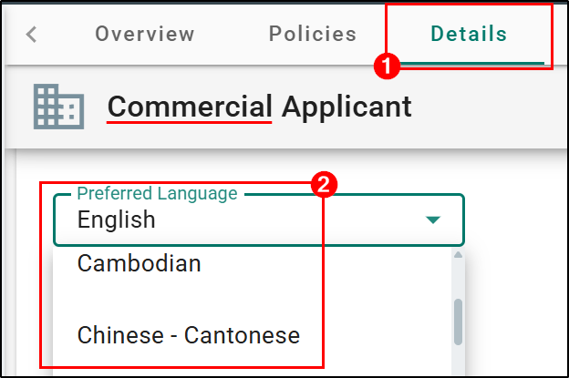 A new Preferred Language field has been added to the Details tab for both Personal Lines and Commercial lines applicants. This field allows you to quickly select or search for one preferred language from a predefined list, with English set as the default option.