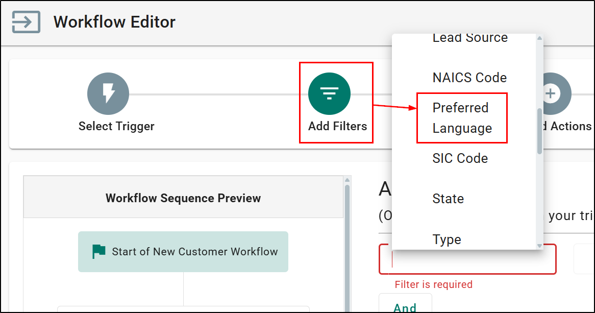 Within the Add Filters step of the Workflow Editor in Automation Center, we have also added a new filter option for Preferred Language.