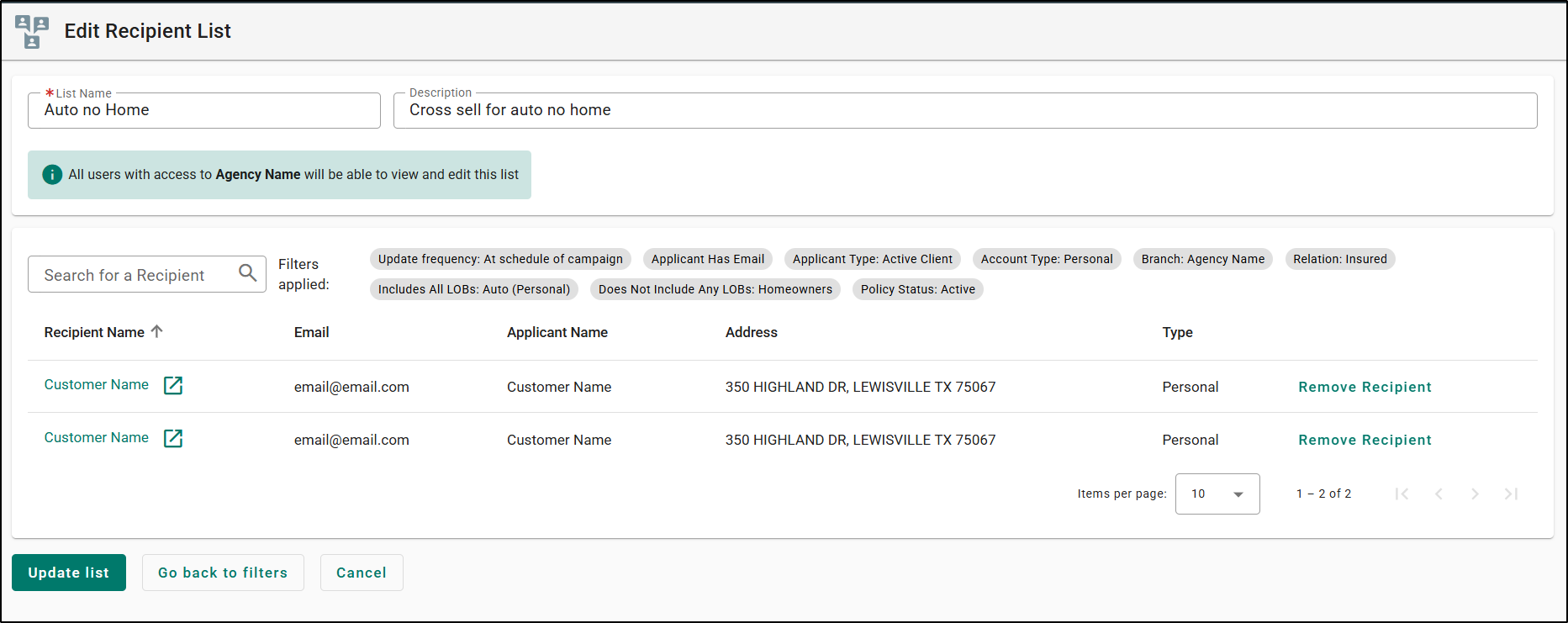 - In the Create New, Edit, and Copy a Recipient List workflow, all recipients have the Remove option by default.