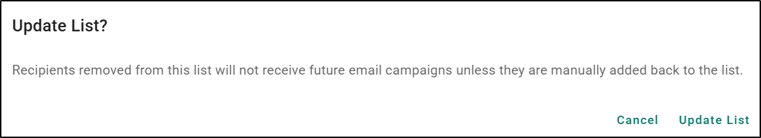 - Update List Confirmation - Shown when updating an existing list with manually removed recipients: "Recipients removed from this list will not receive future email campaigns unless they are manually added back to the list.”