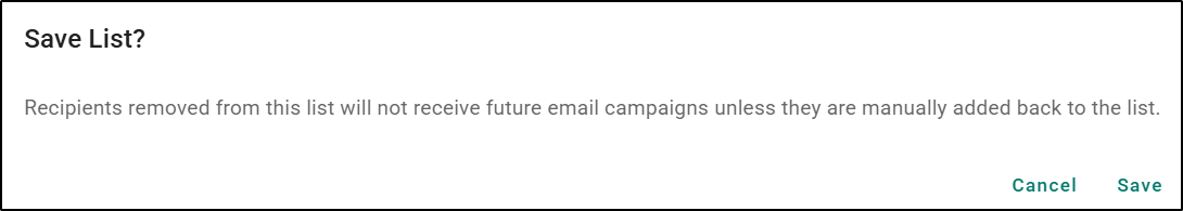 - Save List Confirmation - Shown when saving a list that contains manually removed recipients: “Recipients removed from this list will not receive future email campaigns unless they are manually added back to the list.”