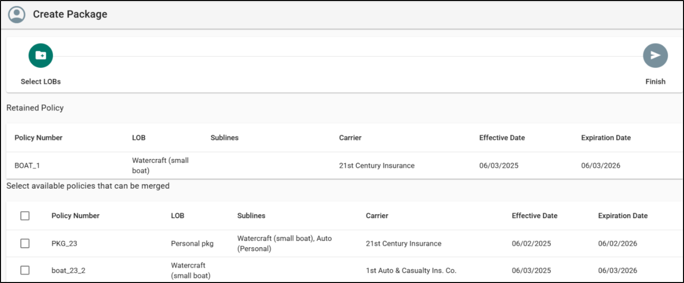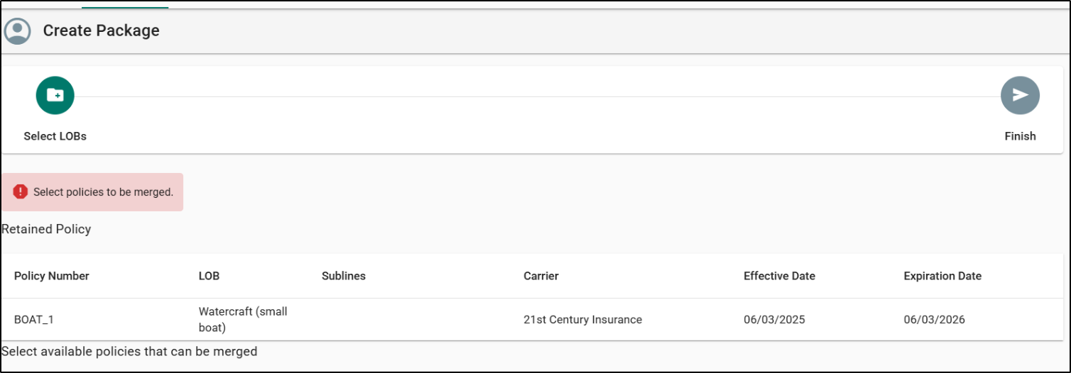 - You cannot create a package when two monoline policies have the same LOB.