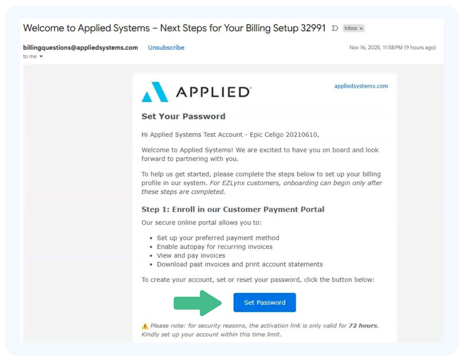 - If you haven't set up your payment portal yet, you can reach out to billingquestions@appliedsystems.com to get your login information.
