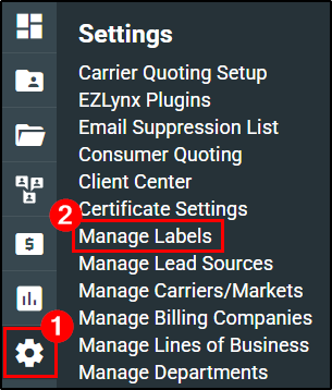 As an Admin, to access the new Label Management page: 1. Hover over the Settings icon on the left navigation bar. 2. Choose Manage Labels. This will take you to the new Label Management page. | ![]() |