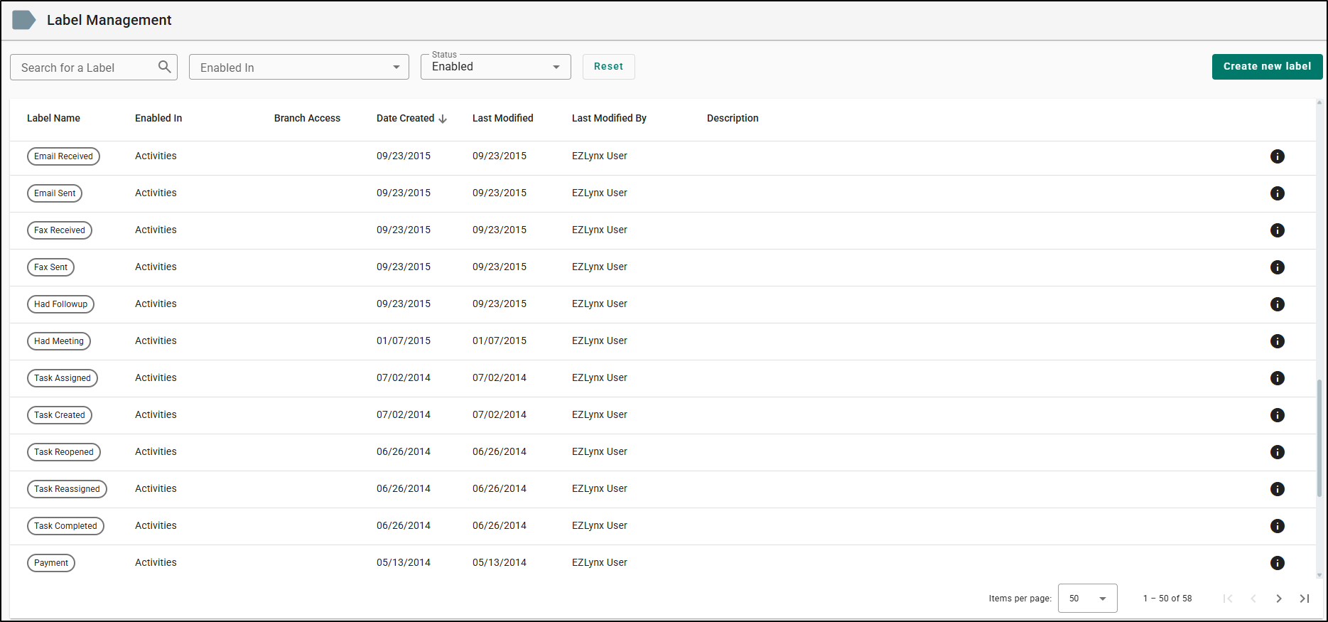 When accessing the page for the first time, you will not see an empty page. The Activity Labels from before are still available as system default labels for activity notes. You can identify them by sorting the Last Modified By column, where they will display the EZLynx User.