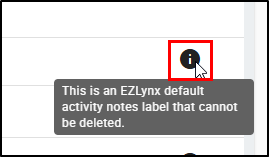 You can also tell by hovering your mouse over the information icon, where the following message will display: "This is an EZLynx default activity notes label that cannot be deleted."