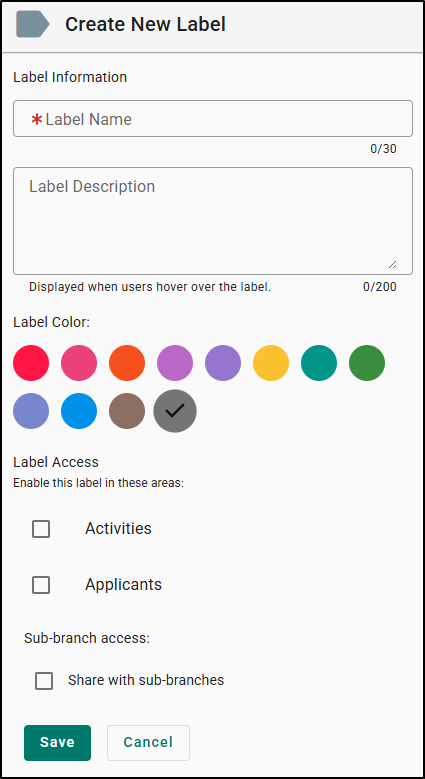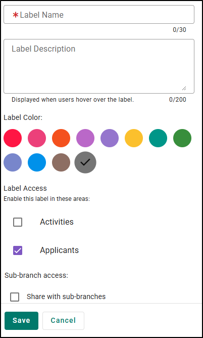 - If you remove access to a particular entity (Applicants or Activities), the label will still appear on existing records where it was previously applied, but users will no longer be able to apply it to records moving forward nor will they be able to remove it from records it was previously applied t