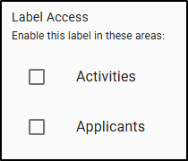 - When an access is enabled, users can apply the label to records within that access. For example, if only Activities access was enabled on the label, users will only be able to apply the label to Activity Notes. To be able to also apply the label to Applicants, the Applicants access would need to be enabled too.
