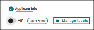After the labels are saved, the Applicant Labels section appears in the Applicant Sidebar under Applicant/Business Info and is visible on the Applicant Details page.