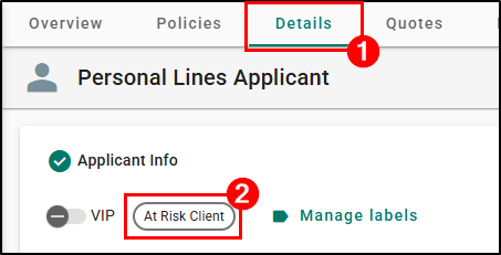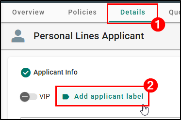 2. On Applicant Details page for an existing customer and on the Create New Applicant page for both Personal and Commercial Lines accounts, you can easily add and manage labels through the new Add Applicant Label/Manage Applicant Label option located next to the VIP selection.