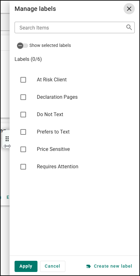 Labels like “VIP Account”, “New Lead”, or “Underwriting Follow-Up” provide instant shared context, helping teams work together smoothly and consistently across the customer lifecycle.