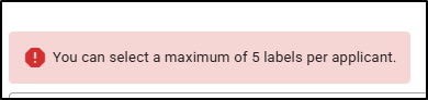 Applying labels to Activity Notes works the same as before. This Beta adds a new option which is to apply labels to Applicants. You can assign up to 5 labels total to an applicant. Up to 5 labels will be shown on the Applicant sidebar, with the most recently added displayed first. Hovering over a label shows its description after a 1-second delay.
