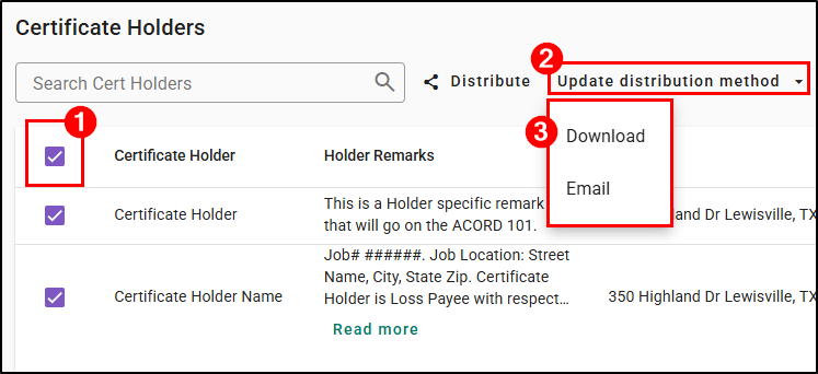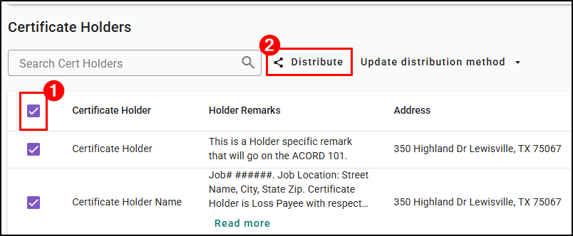 - Bulk Updates: Speed up certificate processing by updating distribution methods and distributing to multiple holders at once, instead of adjusting each one individually.