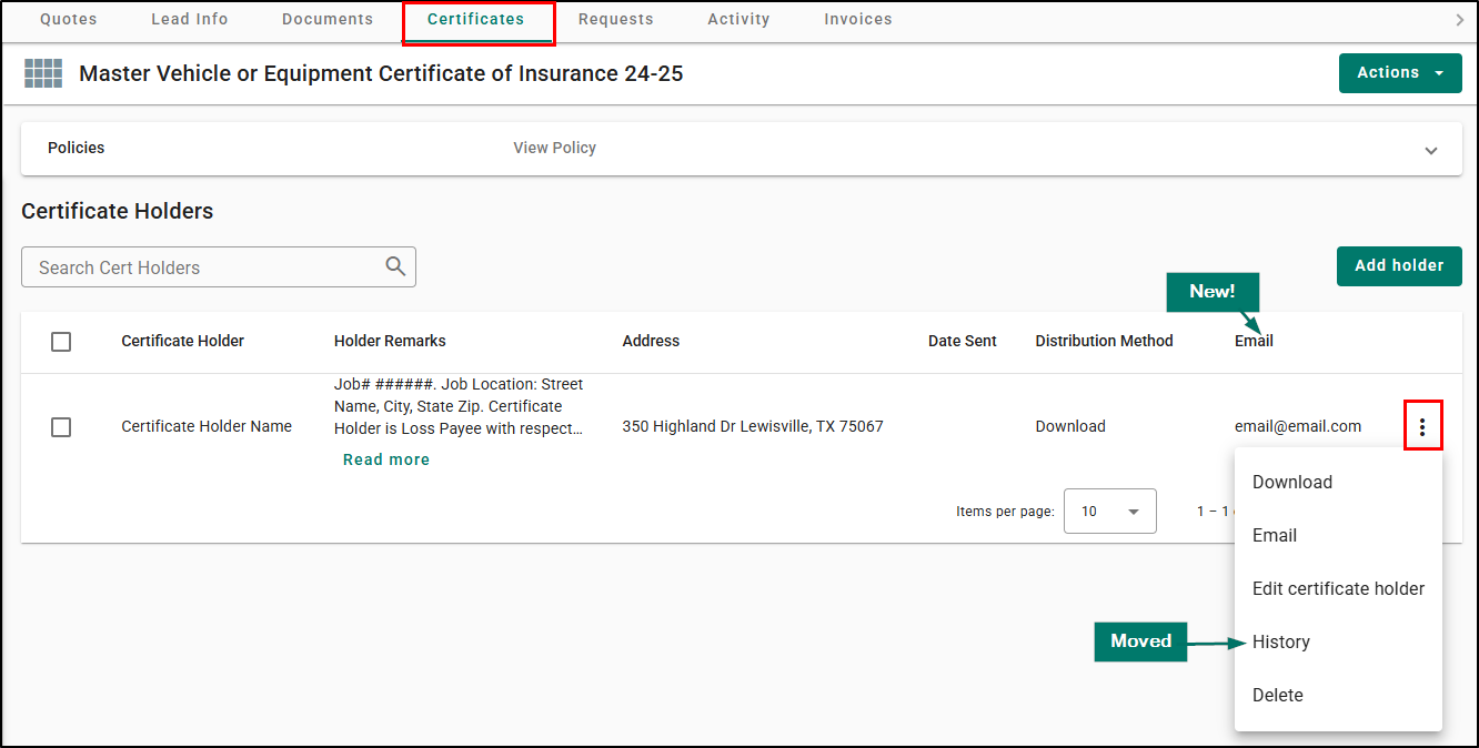 - The History option has been moved into the Action menu for each holder instead of being displayed as a separate column.