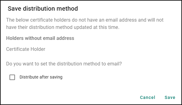 A confirmation message confirms you want to update the holders and in many cases, you’ll have the option to Distribute after saving, allowing you to update the distribution method and send certificates in one step.