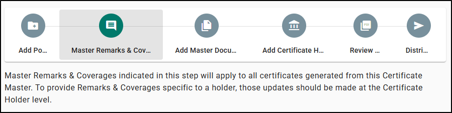 - Master Remarks & Coverages explains that Master Remarks apply across all certificates for the Certificate Master and that holder specific updates belong in Holder Remarks.
