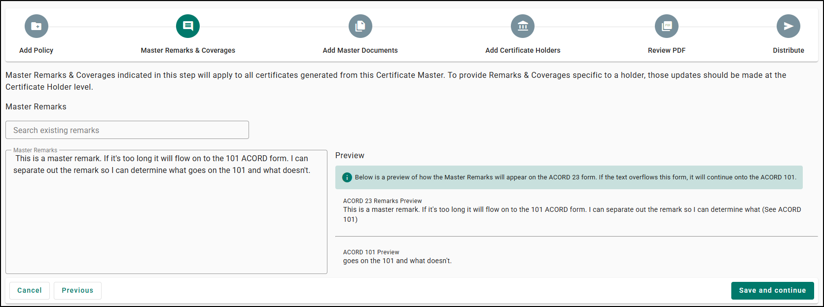 - Before generating certificates, have your team review the Master and Holder Remarks previews to confirm how much text appears on the main form and what continues to ACORD 101.
