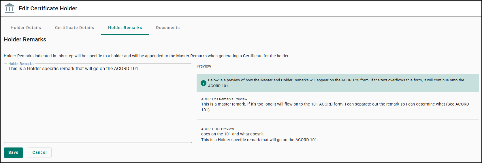 If both Master Remarks and Holder Remarks exist for that holder, the preview shows the combined text as it will print on, the main ACORD form, and ACORD 101 if there is overflow.