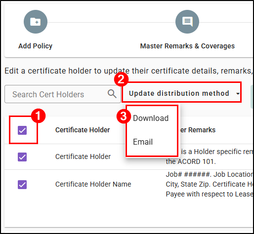 - Select Download or Email as the new distribution method for the selected holders.